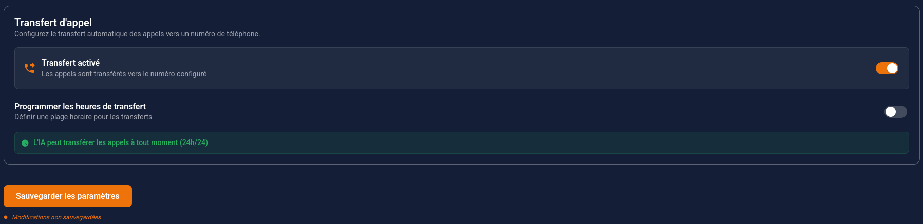 <div align="left"><figure><img src="https://2797821012-files.gitbook.io/~/files/v0/b/gitbook-x-prod.appspot.com/o/spaces%2FEMOCc9qpZQSNmTaZnIY9%2Fuploads%2F0wtWSyqVUTJW4jtVOMU5%2FCapture%20d%E2%80%99%C3%A9cran%20du%202025-09-04%2012-36-08.png?alt=media&#x26;token=aef38114-956a-457d-85d2-b78863b17ac8" alt="Définissez les plages horaires où le transfert d&#x27;appel est autorisé" width="353"><figcaption><p>Définissez l'heure de début où le transfert d'appel est autorisé</p></figcaption></figure> <figure><img src="https://2797821012-files.gitbook.io/~/files/v0/b/gitbook-x-prod.appspot.com/o/spaces%2FEMOCc9qpZQSNmTaZnIY9%2Fuploads%2FXu8Azr8U4viwbVPOQqA7%2FCapture%20d%E2%80%99%C3%A9cran%20du%202025-09-04%2012-36-17.png?alt=media&#x26;token=9129700e-3828-47ea-bfb5-9abb5d4a7457" alt="Définissez l&#x27;heure de fin où le transfert d&#x27;appel est autorisé" width="353"><figcaption><p>Définissez l'heure de fin où le transfert d'appel est autorisé</p></figcaption></figure></div>